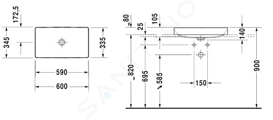 Le dessous de la vasque est rectifié. Ce modèle n'a pas de trou pour le mélangeur de lavabo. Le lavabo Duravit DuraSquare comprend une bonde non refermable avec bouchon en céramique et un kit de fixation.