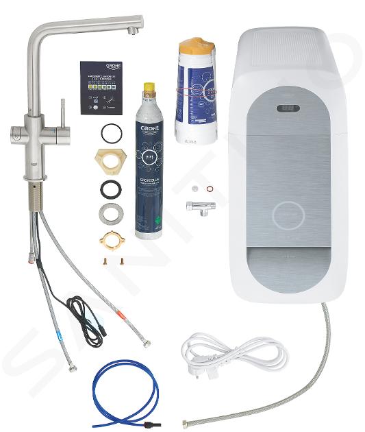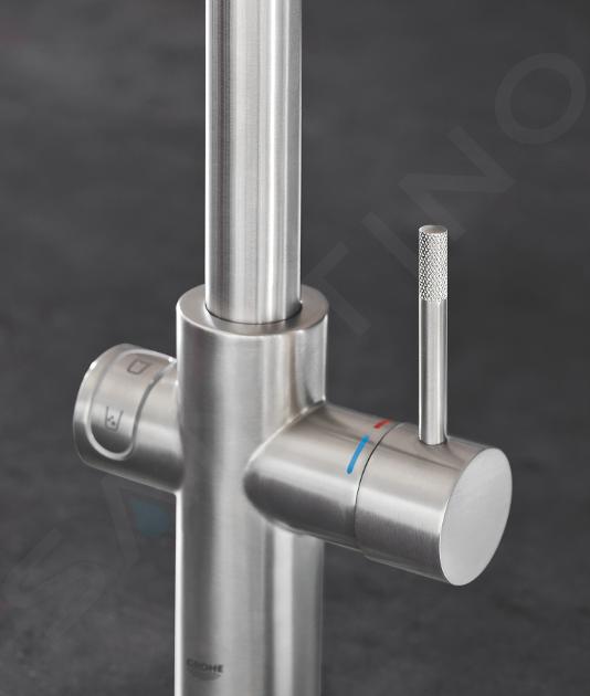 Le corps élégant et lisse du mitigeur d'évier GROHE offre l’opportunité d'obtenir de l'eau purifiée, sans substances indésirables. À l'intérieur du robinet, vous trouverez des conduites d'eau séparées. Le levier est utilisé pour commander l'eau du robinet destinée à laver la vaisselle ou à rincer les aliments, en tournant la poignée sur le côté gauche du robinet, vous commandez l'eau filtrée ou réfrigérée. Vous pouvez choisir entre pétillant, gazeuse ou plate. Les boissons et repas préparés à partir de cette eau ont un goût plus raffiné et vous apprécierez leur arôme plus prononcé. Un avantage est également le fait que l'eau filtrée est moins dure.