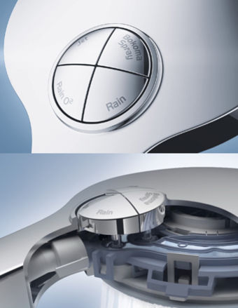 GROHE Rain O2Choissisez entre GROHE Rain Spray classique ou GROHE Rain O2, un jet air/eau doux et fluide. L’air est mélangé à l’eau pour une vaporisation plus large et généreuse.