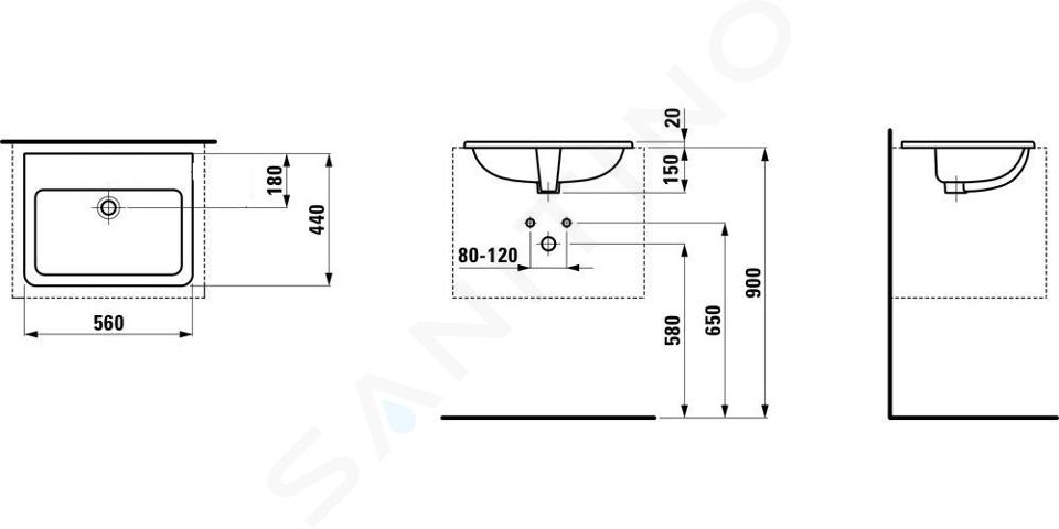 Lavabo sans trou pour robinetterie, avec trop-plein