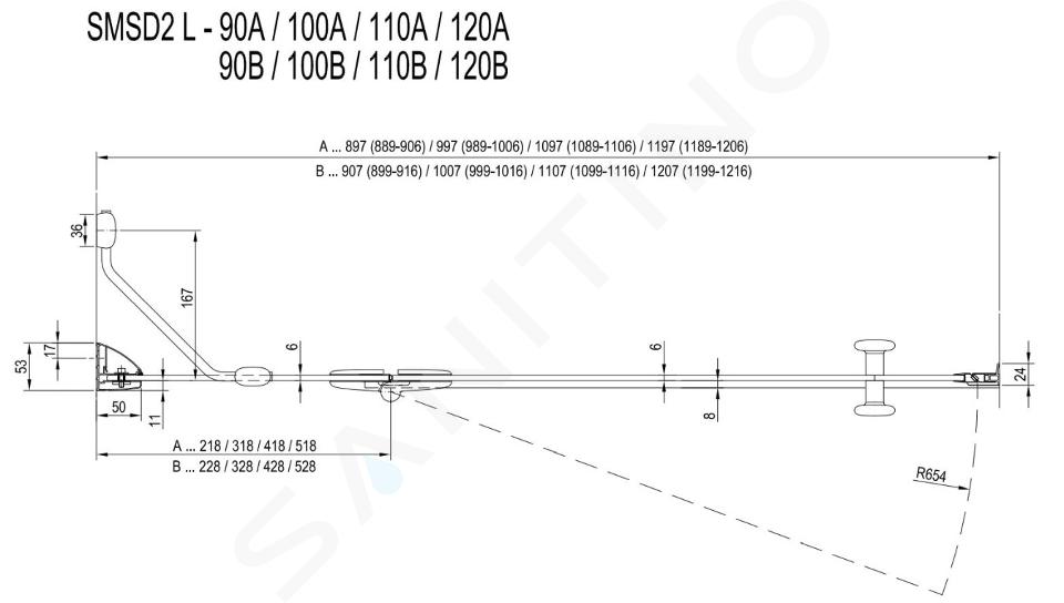 La porte de douche Smartline SMSD2 est produite en 2 variantes. La version A est conçue pour les ouvertures dont la dimension peut être jusqu’à 11 mm inférieure aux dimensions standards du produit. La version B est conçue pour les ouvertures dont la dimension peut être jusqu’à 16 mm supérieure aux dimensions standards du produit. Pour une combinaison avec une paroi fixe, choisissez le type de porte SMSD2 B.