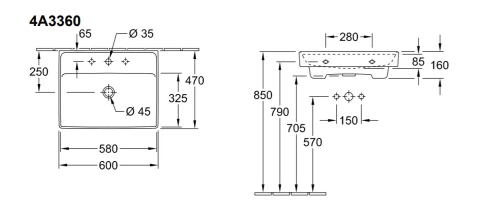Lavabo avec trop-plein pour mitigeur 3 trous trou central percé pour... Afficher la description complète